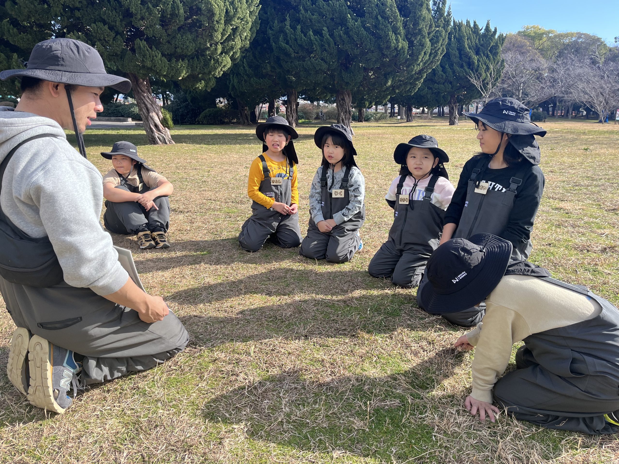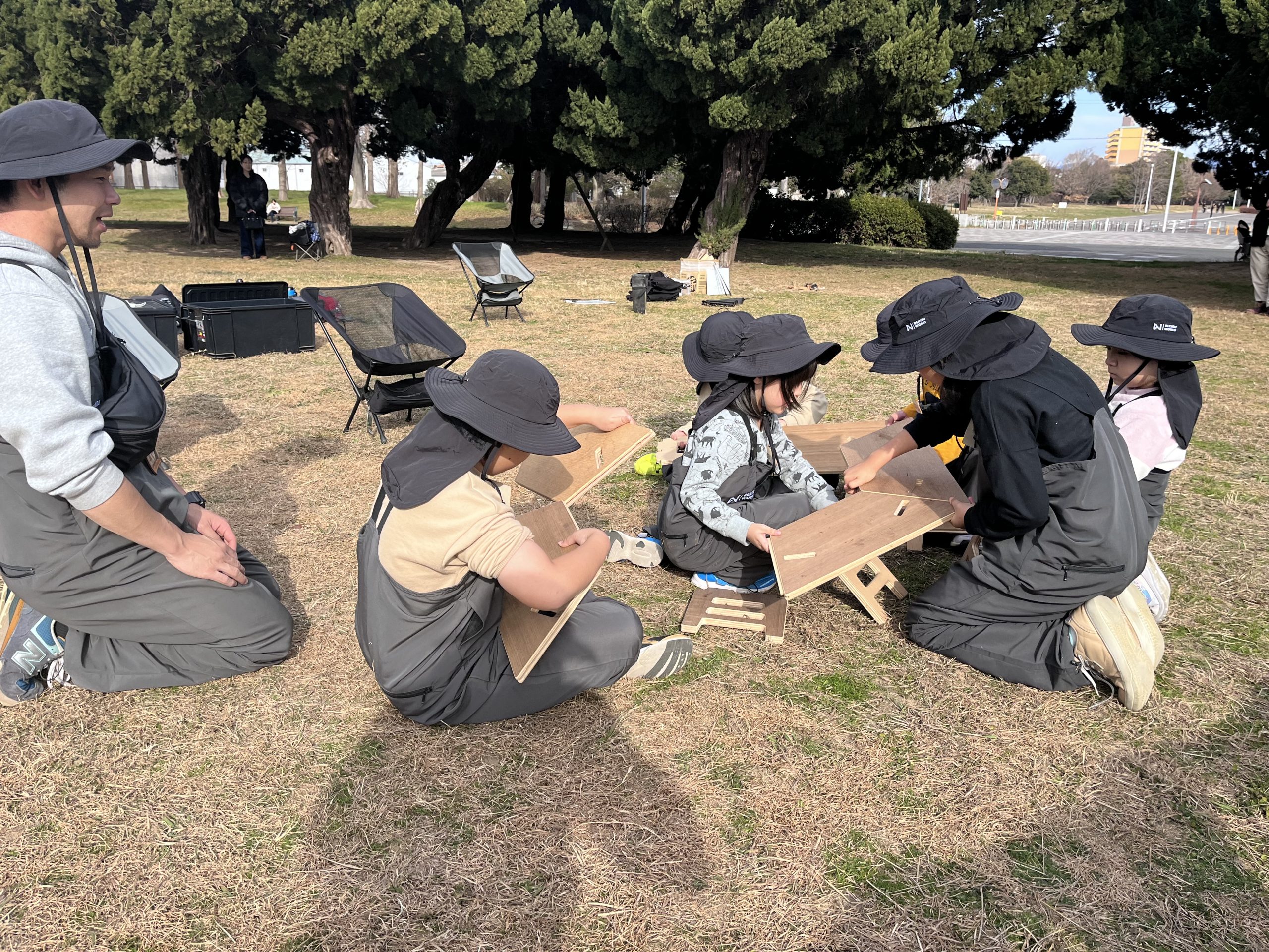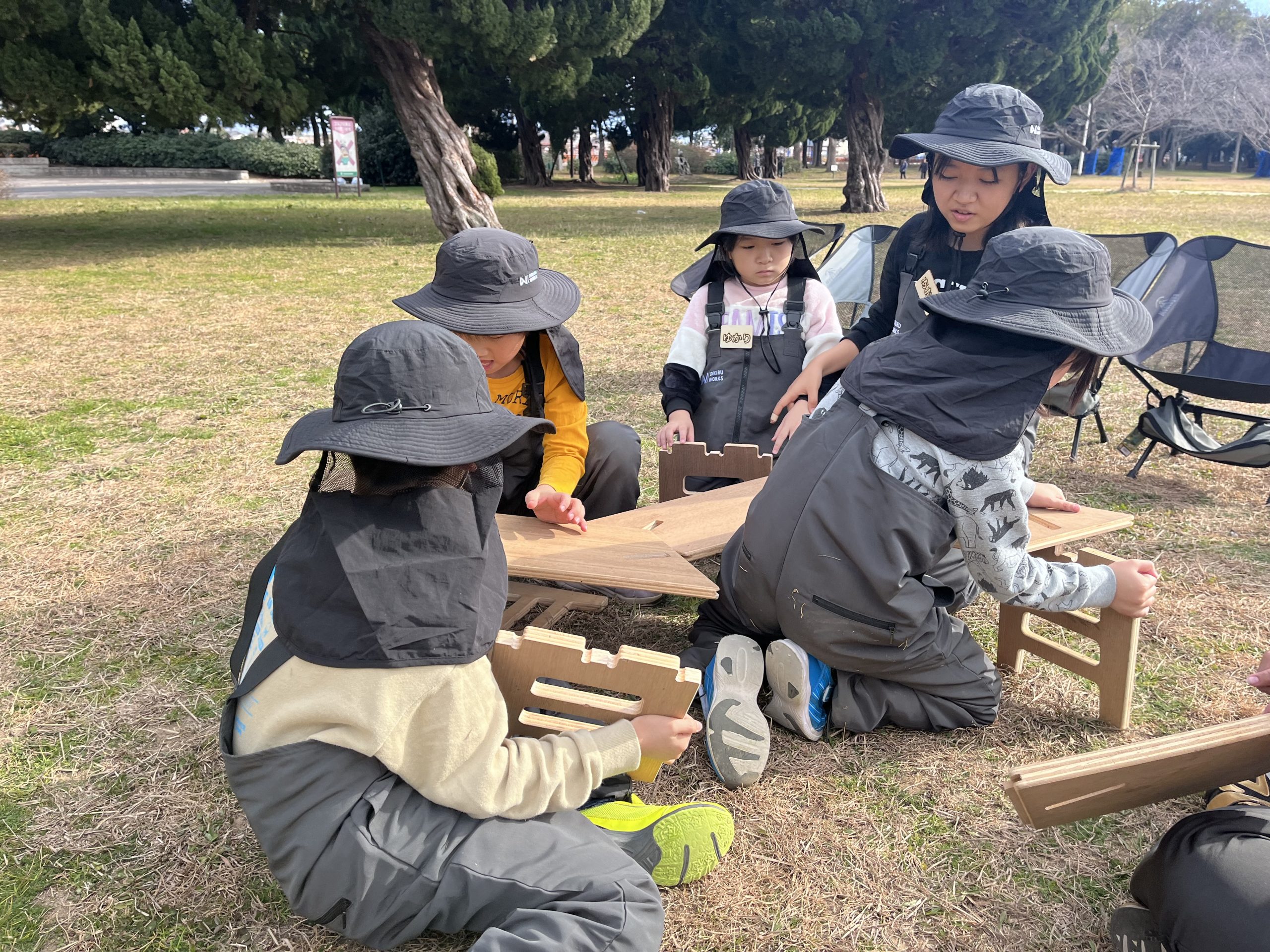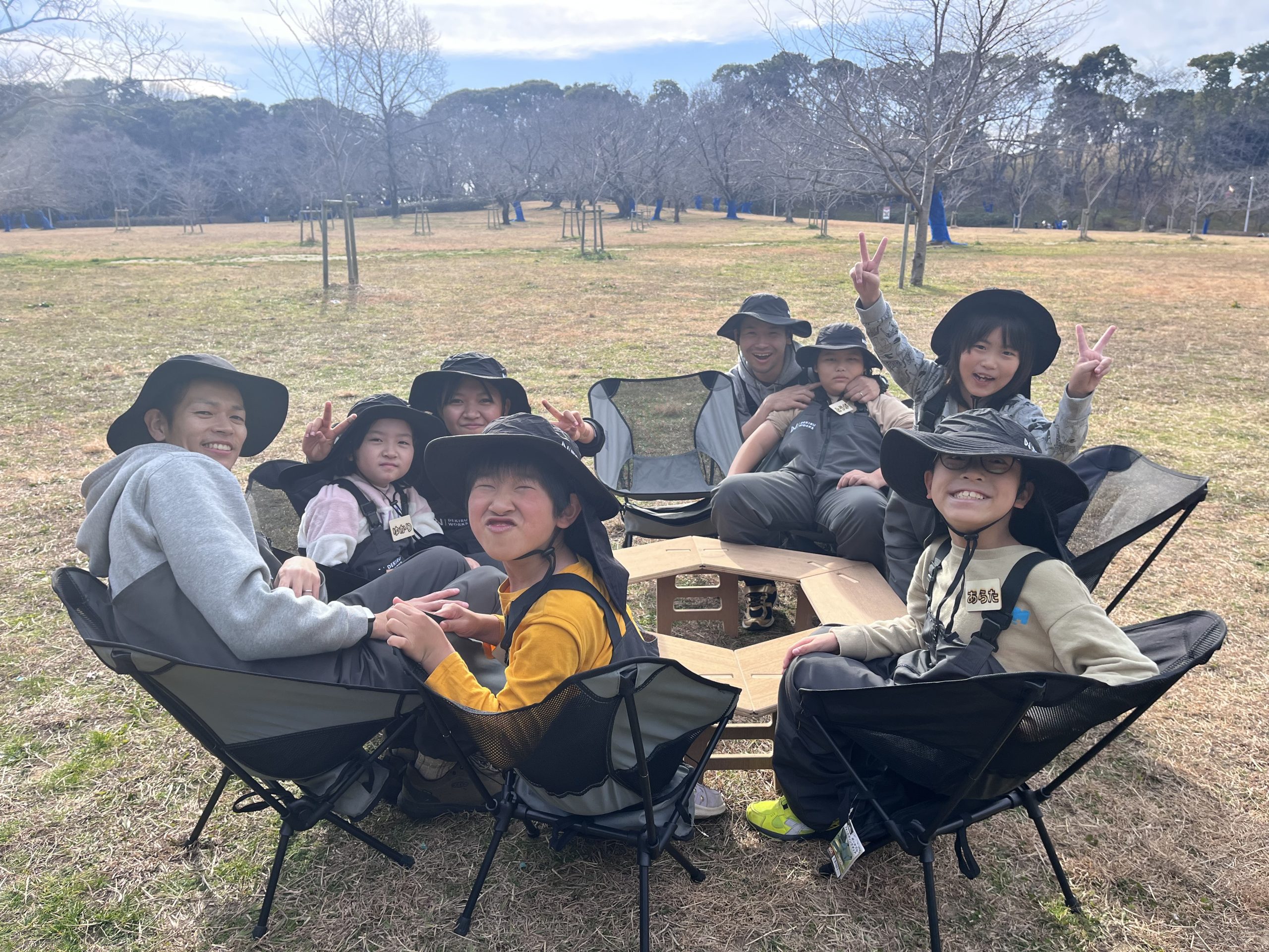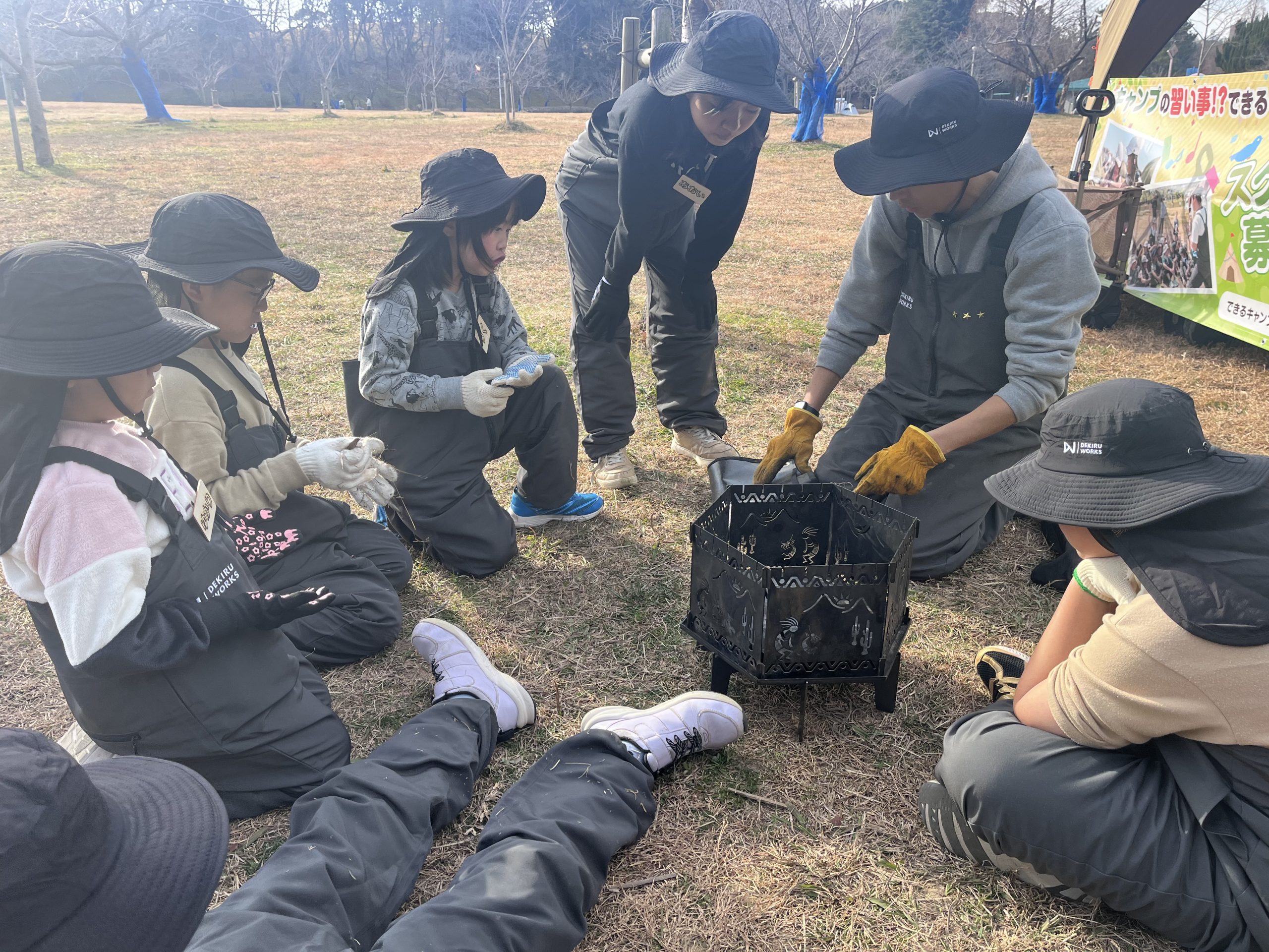 HOME > ニュース > ニュース 大泉スクール 【堺市|大泉緑地】防災キャンプスクール『できるキャンプアカデミー(午後の部)』の活動日誌(1月) 2025年4月17日 1月19日(日)に実施した、できるキャンプアカデミー大泉緑地スクール【午後の部】の様子をお届けします!1月の寒さにも負けず、焚き火を使ったプログラムを行いましたので、最後までご覧ください! 「3つの約束」覚えてる? 今回のスクールは、第2回目ということで、前回にもお話しした、できるキャンプアカデミーが大切にしている「3つの約束」について子ども達とおさらいしました!できるキャンプアカデミーで大事にしている「3つの約束」とは?・「挑戦できる」・「協力できる」・「感謝できる」です!みんなに覚えているか聞くと、すぐに手を挙げて全て答えてくれました!しっかりと覚えてくれていて嬉しかったです♪この3つの約束は、スクール活動中はもちろん普段の学校やお家での生活でもみんなに大切にしてほしい内容です! 焚き火の準備♪ いよいよ焚き火の準備です!まず初めに、ヘキサゴンテーブルを組み立てます!今回は、子ども達が自分で観察して、考える力を身につけてもらいたかったので、あえて先生達は組み立て方を詳しく伝えませんでした。早速、テーブルを観察して「こっち向きじゃない?」「ここに差し込めばいけそう!」など声を掛け合いながら、組み立てを進めていく子ども達!そして、先生達の想像を遥かに上回るスピードで完成!本当にすごい!みんなで協力できたからだね♪ 完成すれば、自分の椅子を綺麗に並べて、ハイチーズ!!この後、みんなで自己紹介したり、お話ししたり、お茶を飲んだりテーブルを囲んで少し休憩しました♪ 「火」についてのお話し 今回は焚き火を使ったプログラム行うので、その前に「火」についてお話ししました。火はとても便利ですが、ルールを守らないと火傷や大怪我に繋がる危険なものです。自分が怪我をしないように、お友達に怪我をさせてしまわないように、お話しをしっかり聴こうねと伝えました。みんな真剣な表情でお話を聞いてくれましたよ! 焚き火をしても良い場所について◯×クイズで考えてもらいました。【地面であればどこで焚き火をしてもいい】というクイズに対しては全員がバツを回答し、その理由として、「草に燃え移ってしまう」「火事になる」などたくさんの意見を出してくれました♪子ども達が言ってくれた通り、地面の上で直接焚き火をしてはダメです!安全に焚き火を行うために、焚き火台を組み立てる必要があります! 焚き火台の組み立て! 先ほど説明したように、焚き火をするには焚き火台を組み立てる必要があります!焚き火台の組み立ては、今回のプログラムで初めて行うことと、組み立て方が少し難しいので、先生から焚き火台の構造や組み立て方をレクチャーしてからスタート!焚き火台にはなぜ穴が空いているでしょう?と質問すると「空気が入りやすくなるため!」と即答してくれた子ども達!その通りです!空気(酸素)は、物が燃焼するために必要なので、空気が通りやすくなるために穴が空いてるんですよ♪説明が終われば、焚き火台の組み立てをスタート!!テーブルの時と同様に、みんなで協力して組み立てることができていました!またしてもみんなの素晴らしい協力のおかげで、先生達は何の手助けもすることなく完成! 燃料を集めよう! 火を利用するために必要な燃料として、キャンプでは薪や炭などがよく用いられます。今回は、公園内にあるものを自分たちで拾い集め、それらを使って火を起こしました!(火を安定させるための薪は用意しており、火付に用いるものを子ども達に集めてもらいました。)探し始めてみると、大泉緑地にはたくさんの枝や木が落ちていて、子どもたちは協力して両手いっぱいに、たくさん拾い集めてくれました!「太い枝があった〜!」や、「木の皮って使えるかな!?」など見つけるたびに報告をしてくれましたよ♪ 火種となる燃料が集まった後は、子ども達に枝を組んでもらいました!空気の通り道ができるように漢字の「井」の形に上手に組んでくれました!着火した後も子ども達に枝や薪をくべてもらいましたが、その姿はまさにキャンパー!笑そして、自分達で大きくした焚き火を使って、お待ちかねの「焼きマシュマロ」を食べました!今日は、テーブルや焚き火台の組み立てから、公園を歩き回って枝集めまで子ども達だけで行ったので、最高のご褒美になったね♪ 最後は、1日の振り返り♪ 今日のスクールの中で、挑戦・協力・感謝できたことをみんなで振り返っていきます! 子ども達からは「友達と協力して焚き火台やテーブルを組み立てた」「枝を拾うことに挑戦できた」などたくさん発表してもらいました!今回で2回目となった大泉緑地スクール【午後の部】ですが、早くもみんなの成長を感じられた1日でした!2月ももみんな会えること楽しみにしています♪ スクール生、随時募集中! できるキャンプアカデミーでは各会