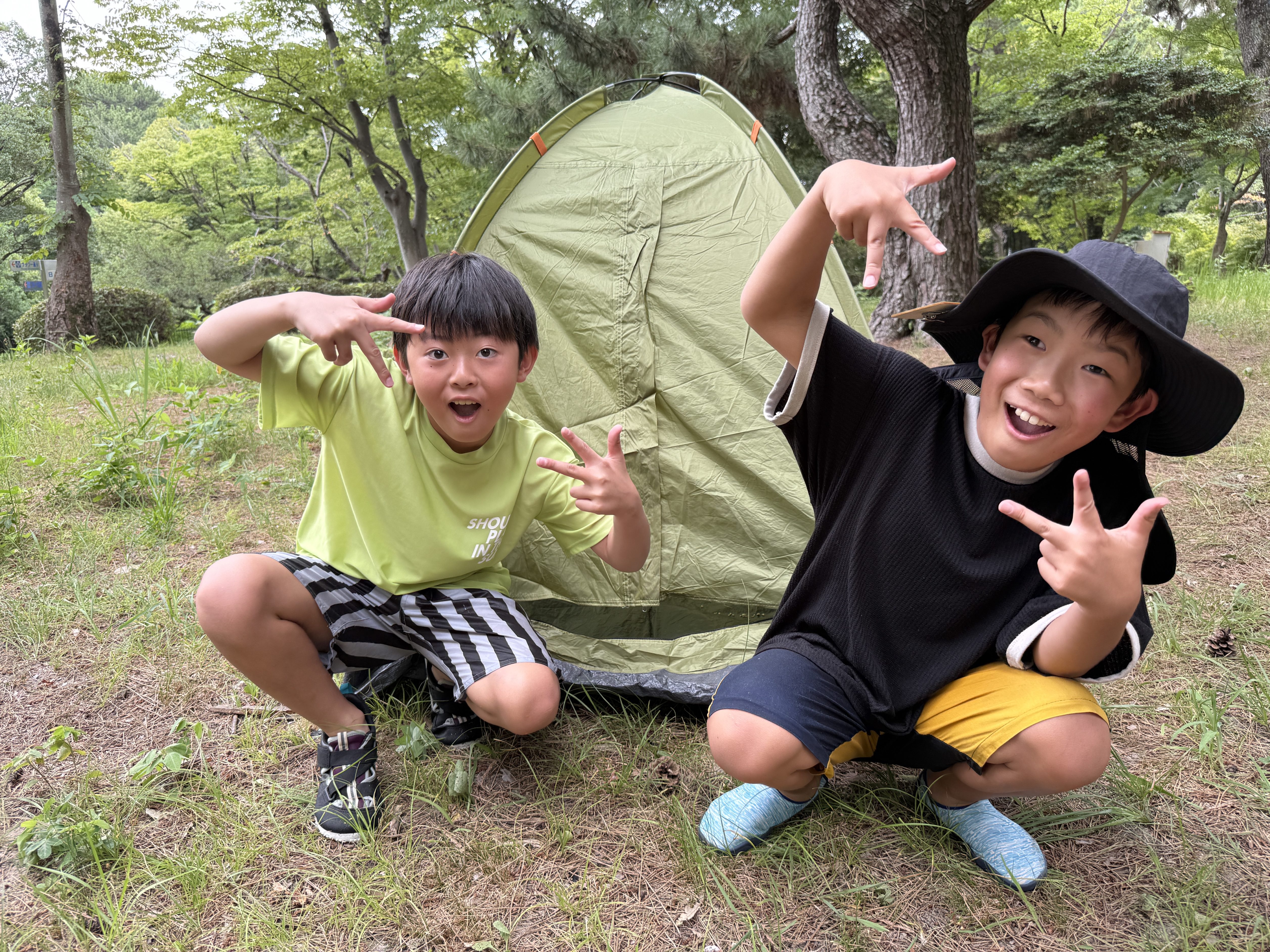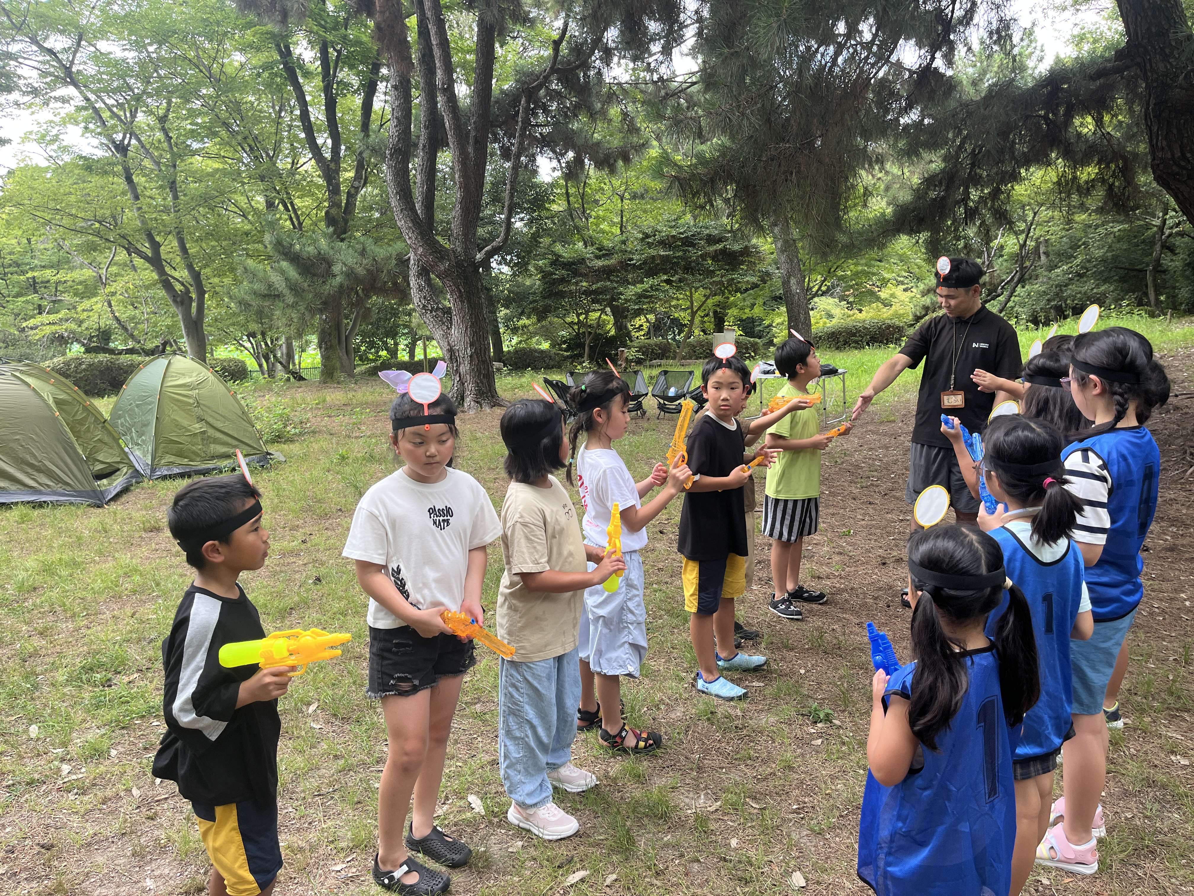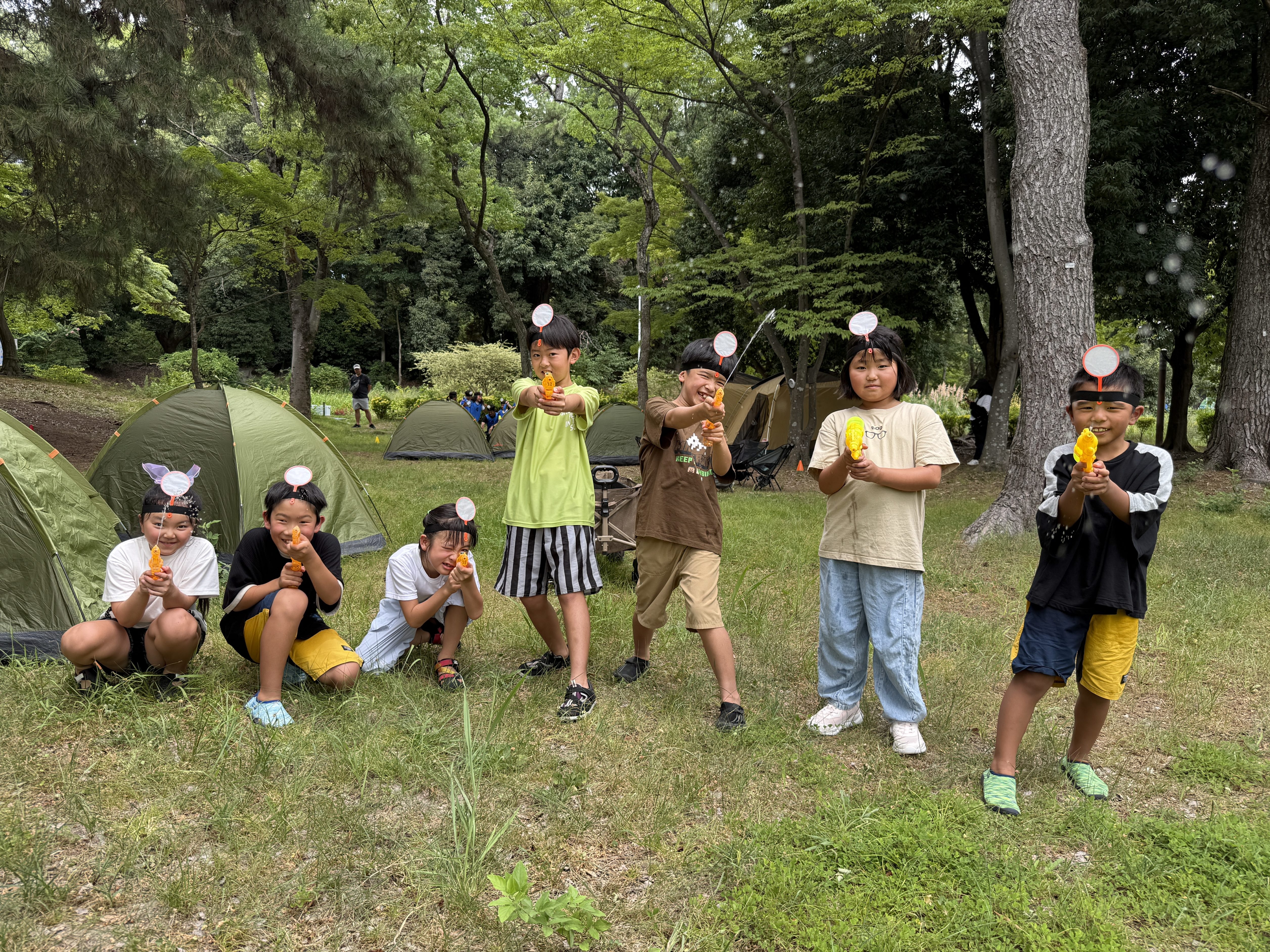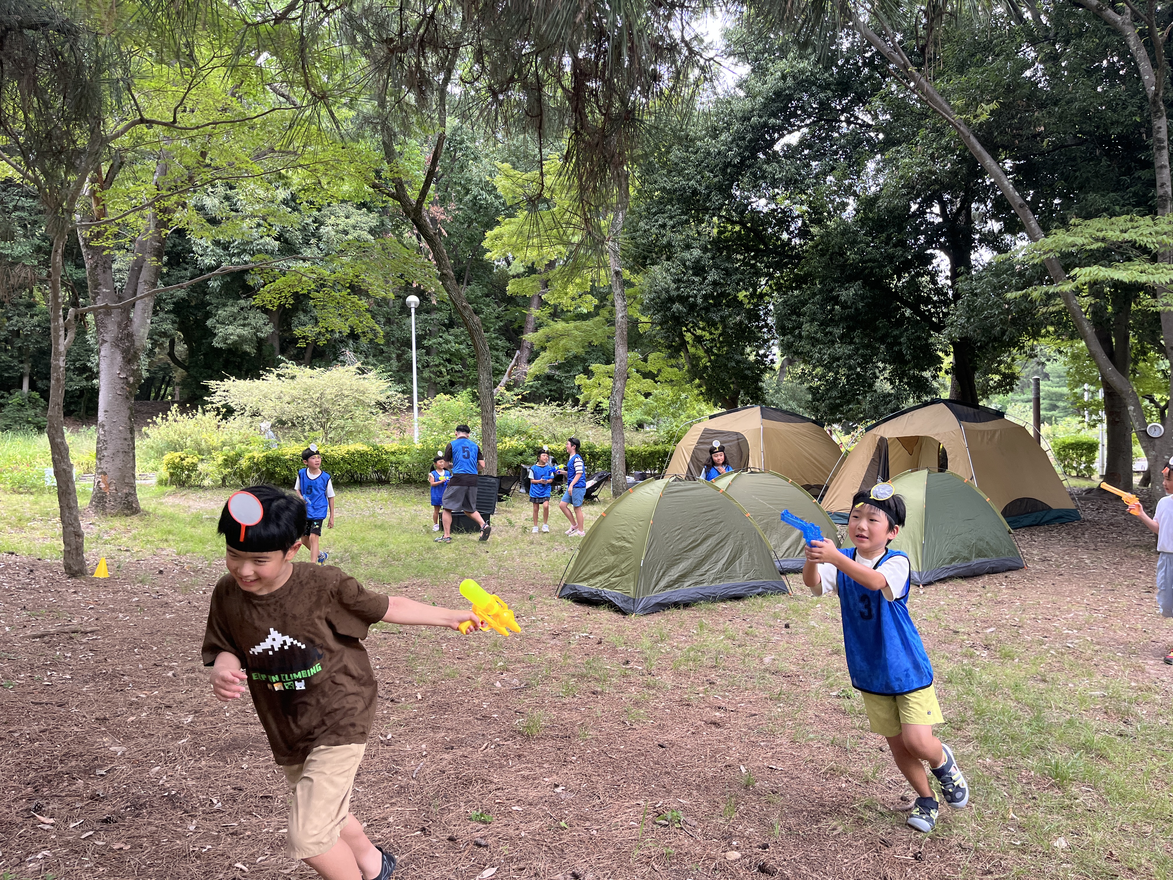HOME > アカデミーについて > アカデミーについて ニュース 服部スクール 【豊中市|服部緑地】防災キャンプスクール『できるキャンプアカデミー』活動日誌(8月) 2025年8月7日 8月2日(土)、大阪府豊中市の服部緑地にて実施した服部スクールの活動の様子をご紹介します。今回は、初めてスクールに参加するお友だちも多くいたため、まずはしっかりと規律について学ぶ時間をとりました。その後は、暑い夏でも楽しく取り組めるプログラムとして「ウォーターサバゲー」を実施!水を使ったアクティビティで、みんな元気いっぱいに楽しんでいました。子どもたちが楽しそうに活動している様子を記事にまとめましたので、ぜひご覧ください。 できるキャンプアカデミーが大切にしている3つのお約束 できるキャンプアカデミーには、子どもたちに大切にしてほしい「3つの約束」があります。これはスクール中はもちろん、日常のさまざまな場面でも意識してもらいたいと伝えているものです。その3つとは、「挑戦できる」「協力できる」「感謝できる」——**“3つのできる”**です。私たちは、ただキャンプの技術が身につくだけでなく、子どもたちが一人の人として“心”も育っていくことを大切にしています。はじめてのことや苦手なことに挑戦することの価値、仲間と協力する素晴らしさ、感謝する気持ちの大切さを、日々の活動を通して伝えています。また、3つの約束だけでなく、道具の扱い方や列の並び方といった基本的なマナーについてもお話ししました。初回のスクールだからこそ、しっかりと伝えて、これからみんなで少しずつ一緒に成長していけたらと思っています。 3つのお約束については、こちらの動画でも詳しく解説しております テントが盾に!?「ウォーターサーバー」フィールド作り 規律をしっかり学んだあとは「ウォーターサバゲー」のフィールド作りとして、相手チームからの攻撃を防ぐ、盾となるテントを立てていきます。指導員が見守る中、チームで協力しながら設営を進めていきました。設営が終わったら次は、ウォーターサバゲーのルール説明です。今回はただ打ち合うだけじゃなく、王様が頭につけているポイを破ったチームが勝つというルールで行います。子供たちにはルールを理解してもらった上で、フィールド内にテントをどう配置するか、誰が王様をするかなど、作戦会議を行ってもらいました。「3つバラバラにおいた方が攻めながら隠れることができそうじゃない?」「1カ所に固めた方が守りは強そう!」「誰が王様かわからないように相手を混乱させよう!」など、作戦を立てる様子は真剣そのものでした。 水鉄砲を撃ちまくれ!熱き戦い「ウォーターサバゲー」 準備が整うと、いよいよ子どもたちが楽しみにしていたウォーターサバゲーの開始です。水鉄砲を手に整列し、ルールの確認と「思いきり楽しもう!」という約束を再確認。元気よく挨拶をして、ゲームスタート! 子どもたちは水に濡れることも気にせず、笑顔ではしゃぎながら全力で走り回ります。水しぶきを浴びながら敵チームを狙い撃ちし、命中した瞬間には「やったー!」と声を上げて大喜び。勝ったチームは、仲間と手を取り合って飛び跳ねるように喜び、負けたチームの子も「次は絶対勝つ!」と前向きな表情で意気込んでいました。全身びしょ濡れになりながらも、どの子の顔にも満面の笑みが広がり、仲間と声をかけ合いながら作戦を立てる姿も見られました。勝ち負けを越えて、みんなで思いきり楽しんだウォーターサバゲーは、子どもたちにとってまさに「夏の思い出」。遊びの中でも自然とチームワークやコミュニケーションが生まれる、印象的な時間となりました。 最後は1日の振り返り 活動の締めくくりには、今日一日を通して感じたことや学んだことについて、みんなで振り返りを行いました。「初めてのウォーターサバゲーだったけど、思いっきり楽しむことができた」「みんなと協力して作戦を立てた」「テントの組み立てで手伝ってもらった時に“ありがとう”と言えた」など、一人ひとりから前向きな言葉がたくさん出てきました。今回のスクールでも、挑戦する姿、仲間と協力する姿、感謝の気持ちを言葉にする姿など、子どもたちの成長を随所に感じることができました。次回のスクールでも、みんなと一緒に新しい体験ができるのを楽しみにしています! スクール生、随時募集中! できるキャンプアカデミーでは各会場でスクール生の募集を行っています。普段のスクールに無料で体験参加できますので、気になる方は下記よりお申し込みください! 体験会参加のお申し込みはコチラ 日曜日の服部スクールでの過去の活動日誌はこちらから♪ 【豊中市|服部緑地】防災キャンプスクール『できるキャンプアカデミー』活動日誌(7月)7月5日(土)に大阪府豊中市の服部緑地にて実施した、服部スクールの活動の様子をご紹介します。今回のプログラムは「挑戦・協力・感謝」をテーマに、薪割り