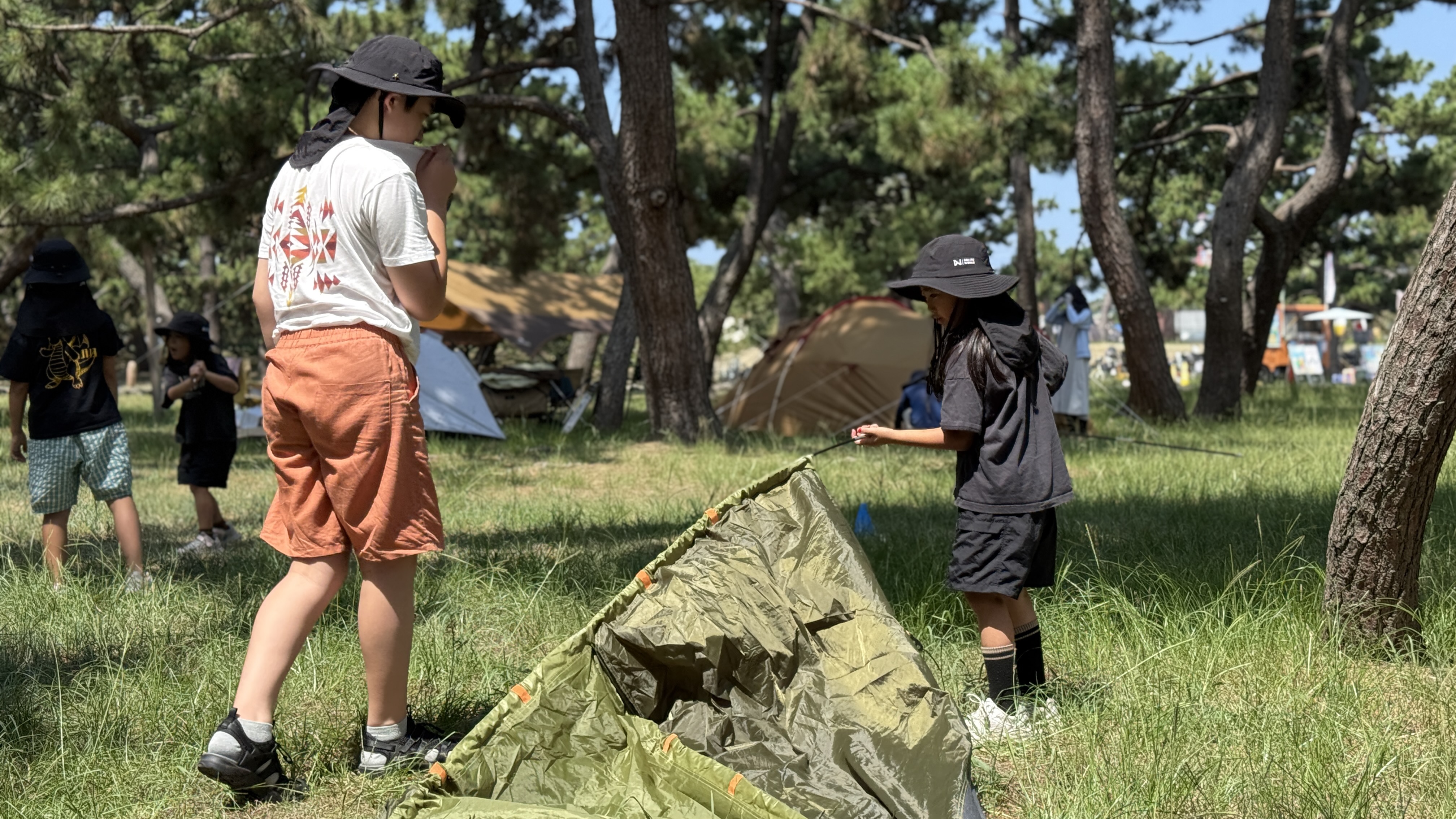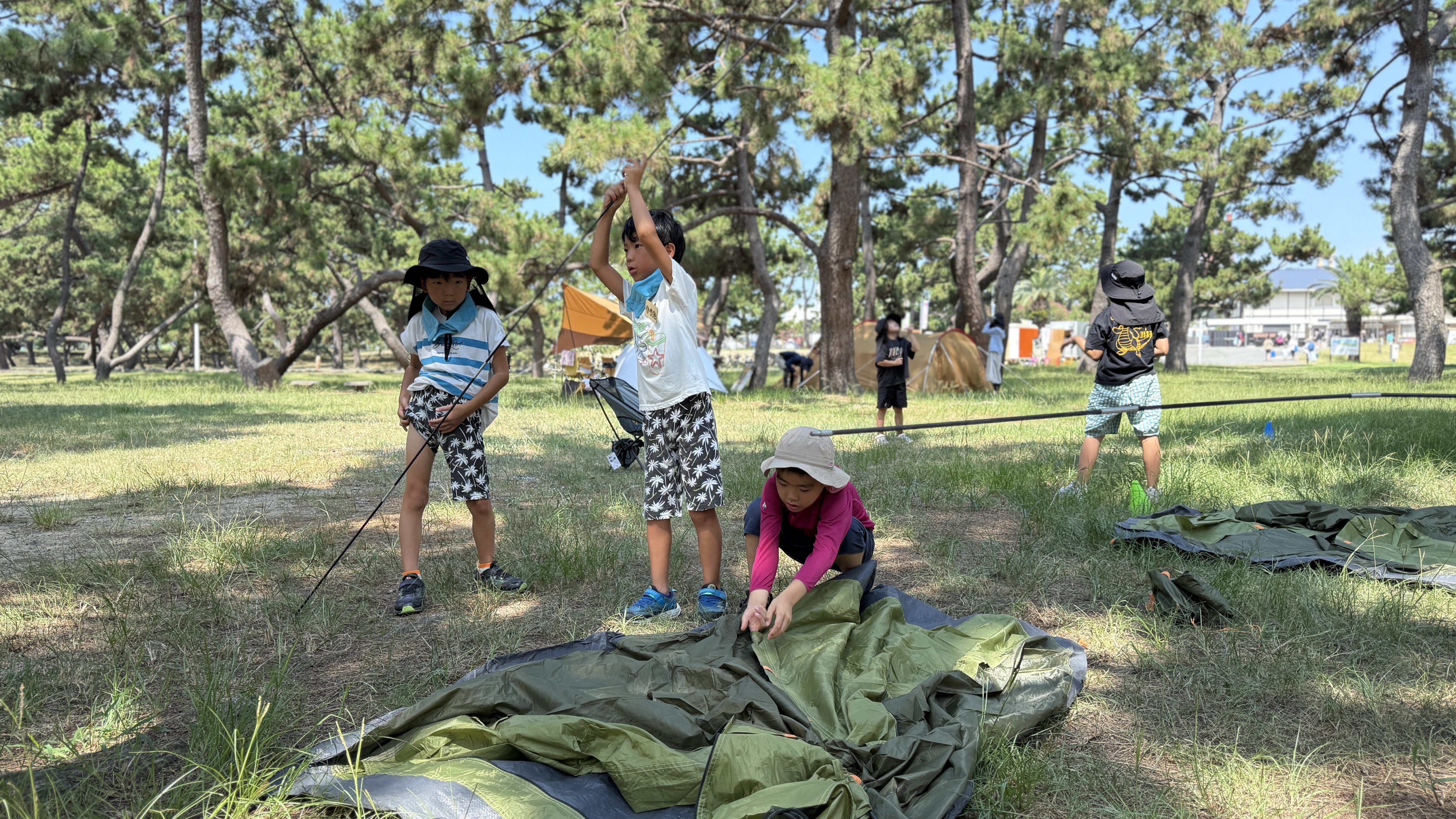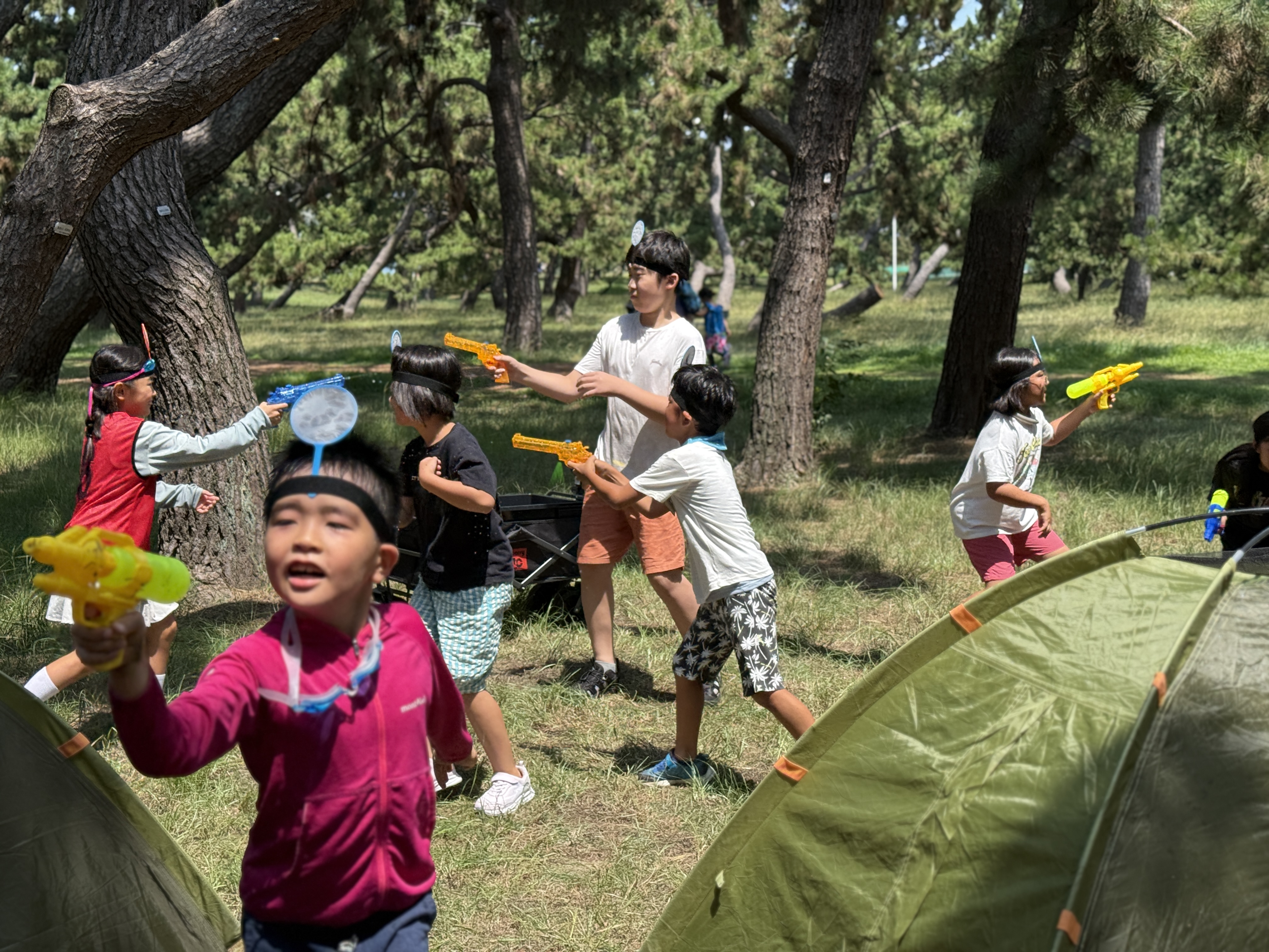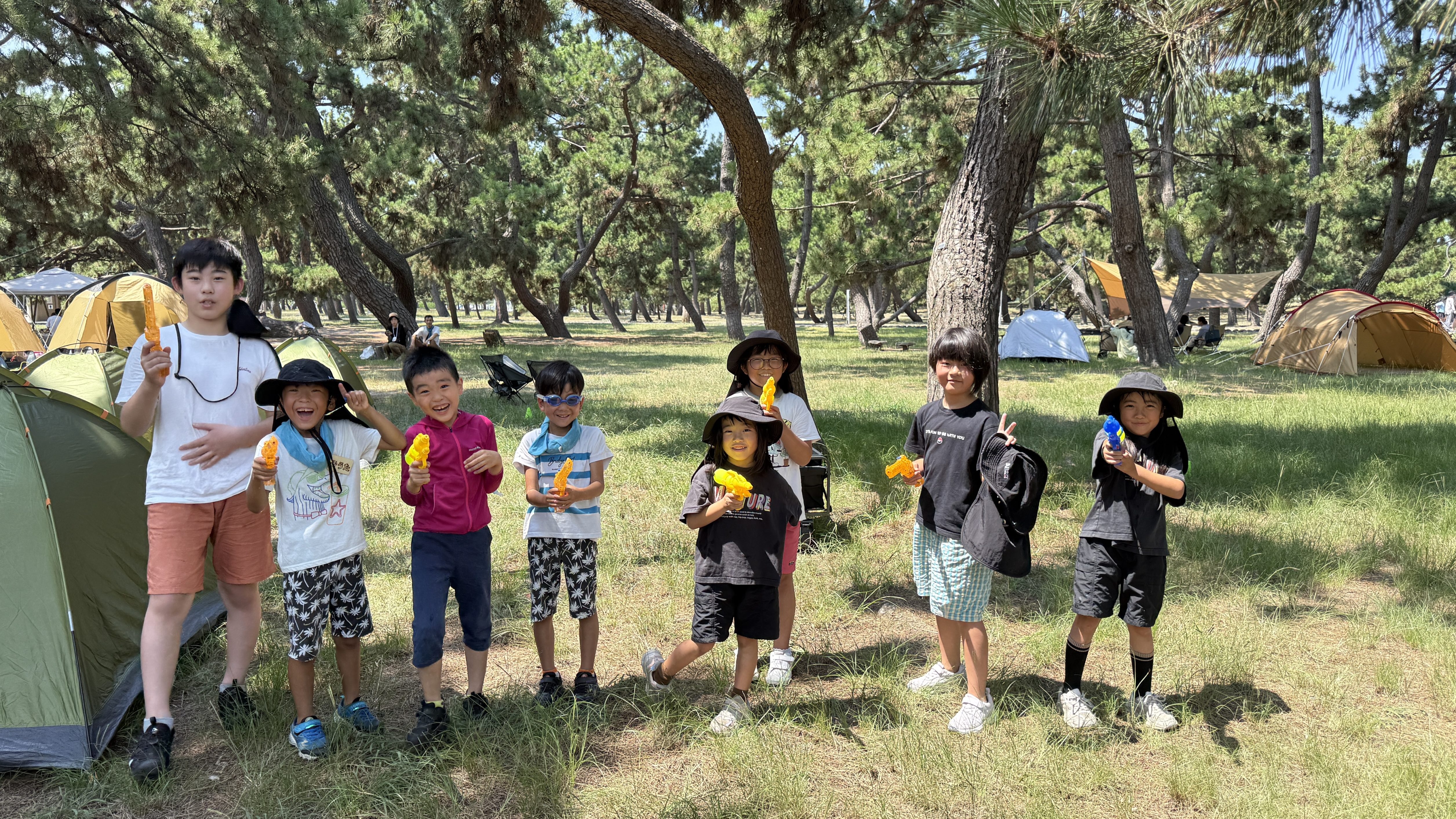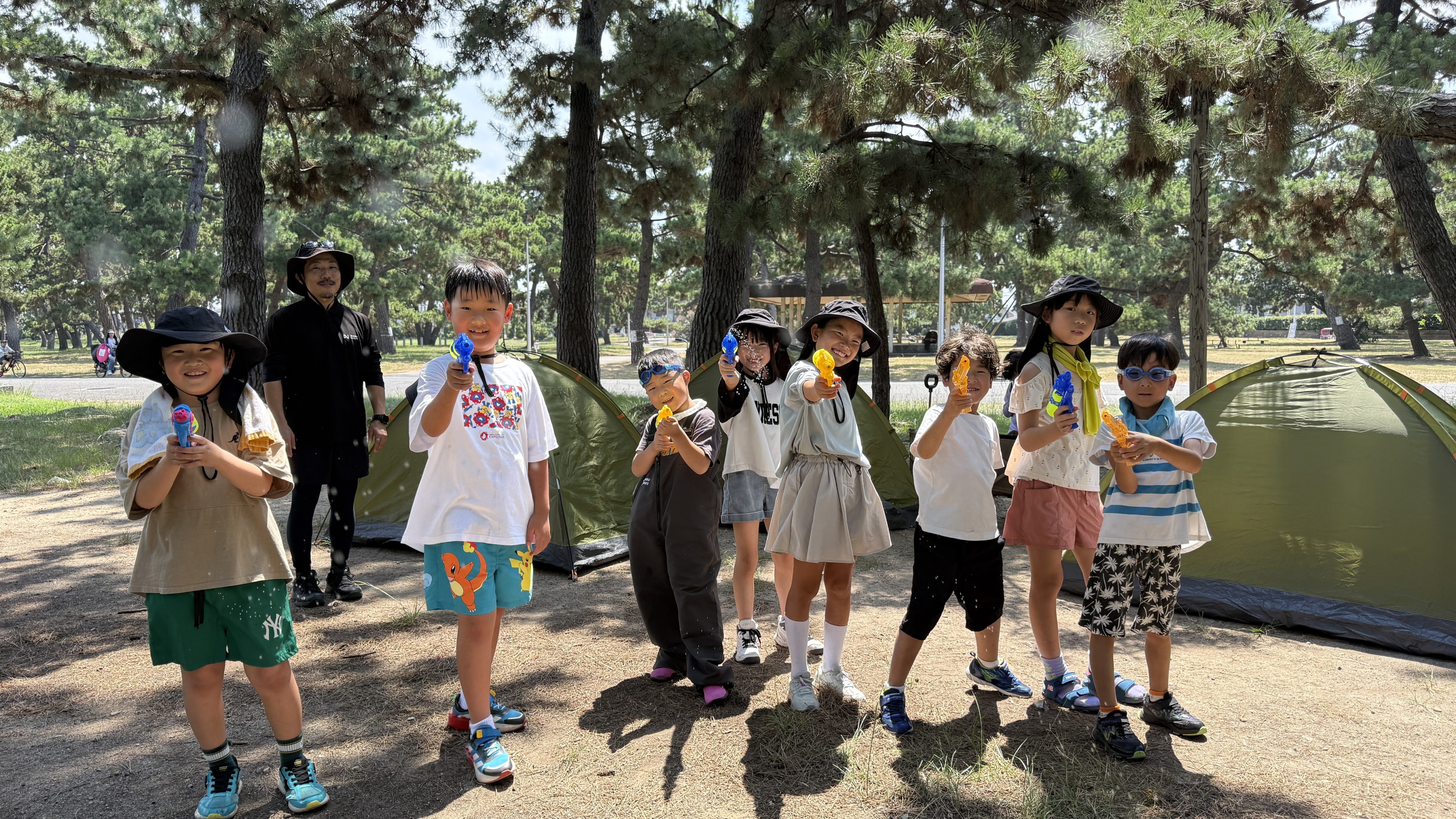 HOME > アカデミーについて > アカデミーについて ニュース 浜寺スクール 【堺市|浜寺公園】防災キャンプスクール『できるキャンプアカデミー』活動日誌(8月) 2025年8月7日 8月3日(日)、大阪府堺市の浜寺公園にて実施した浜寺スクールの活動の様子をご紹介します。今月のプログラムは、暑い夏だからこそ楽しめる「ウォーターサバゲー」を実施!水を使ったアクティビティで、みんな元気いっぱいに楽しんでいました。子どもたちが楽しそうに活動している様子を記事にまとめましたので、ぜひご覧ください。 テントが盾に!?「ウォーターサーバー」フィールド作り 最初のプログラムは、「ウォーターサバゲー」のフィールド作りとして、相手チームからの攻撃を防ぐ、盾となるテントを立てていきます! 指導員が見守る中、チームで協力しながら設営を進めていきました! 設営が終わったら次は、ウォーターサバゲーのルール説明です。 今回はただ打ち合うだけじゃなく、王様が頭につけているポイを破ったチームが勝つというルールで行います。 子供たちにはルールを理解してもらった上で、フィールド内にテントをどう配置するか、誰が王様をするかなど、作戦会議を行ってもらいました。 「3つバラバラにおいた方が攻めながら隠れることができそうじゃない?」 「1カ所に固めた方が守りは強そう!」 「誰が王様かわからないように相手を混乱させよう!」 など、作戦を立てる様子は真剣そのものでした。 水鉄砲を撃ちまくれ!熱き戦い「ウォーターサバゲー」 準備が整うと、いよいよ子どもたちが楽しみにしていたウォーターサバゲーの開始です。水鉄砲を手に整列し、ルールの確認と「思いきり楽しもう!」という約束を再確認。元気よく挨拶をして、ゲームスタート! 子どもたちは水に濡れることも気にせず、笑顔ではしゃぎながら全力で走り回ります。水しぶきを浴びながら敵チームを狙い撃ちし、命中した瞬間には「やったー!」と声を上げて大喜び。勝ったチームは、仲間と手を取り合って飛び跳ねるように喜び、負けたチームの子も「次は絶対勝つ!」と前向きな表情で意気込んでいました。全身びしょ濡れになりながらも、どの子の顔にも満面の笑みが広がり、仲間と声をかけ合いながら作戦を立てる姿も見られました。勝ち負けを越えて、みんなで思いきり楽しんだウォーターサバゲーは、子どもたちにとってまさに「夏の思い出」。遊びの中でも自然とチームワークやコミュニケーションが生まれる、印象的な時間となりました。 最後は片付けと1日の振り返り 活動の後は、みんなで協力してお片付け!先生達が声をかけなくても進んで片付けをしてくれる子ども達がたくさん!みんなの協力する姿が素敵でした!そして締めくくりには、今日一日を通して感じたことや学んだことについて、みんなで振り返りを行いました。「初めてのウォーターサバゲーだったけど、思いっきり楽しむことができた」「みんなと協力して作戦を立てた」「椅子の片付けで手伝ってもらった時に“ありがとう”と言えた」など、一人ひとりから前向きな言葉がたくさん出てきました。今回のスクールでも、挑戦する姿、仲間と協力する姿、感謝の気持ちを言葉にする姿など、子どもたちの成長を随所に感じることができました。次回のスクールでも、みんなと一緒に新しい体験ができるのを楽しみにしています! スクール生、随時募集中! できるキャンプアカデミーでは各会場でスクール生の募集を行っています。普段のスクールに無料で体験参加できますので、気になる方は下記よりお申し込みください! 体験会参加のお申し込みはコチラ 日曜日の浜寺スクールでの過去の活動日誌はこちらから♪ 【堺市|浜寺公園】防災キャンプスクール『できるキャンプアカデミー』の活動日誌(7月)7月6日(日)に大阪府堺市の浜寺公園にて開催した「できるキャンプアカデミー浜寺公園スクール」の様子をお届けします。今回のプログラムでは、トンネルテントの設営とロープワークに挑戦しました。ちょっと難しそ ... 【堺市|浜寺公園】防災キャンプスクール『できるキャンプアカデミー』の活動日誌(6月)6月1日(日)大阪府堺市の浜寺公園にて開催した「できるキャンプアカデミー浜寺公園スクール」の様子をお届けします!今回は、防災バッグについて考えるプログラムや、昇級試験に向けた実践練習、そして子ども達が ... 他スクールでの過去の活動や、イベント記事はこちらから♪ 【高槻市|安満遺跡公園】宿泊キャンプイベント「デキルキャンパークin安満遺跡公園」4月19日〜20日に大阪府高槻市の安満遺跡公園にて、宿泊キャンプイベント「デキルキャンパークin安満遺跡公園」が開催されました。 普段泊まることのできない公園を利用した宿泊キャンプイベントの様子をお届 ... 【神戸市|みなとのもり公園】震災と未来の神戸博『チャレンジ防災キャンプ!!』4月26-27日(土,日)に兵庫県神戸市のみなとのもり公園(神戸震災復興記念公園)にて開催された