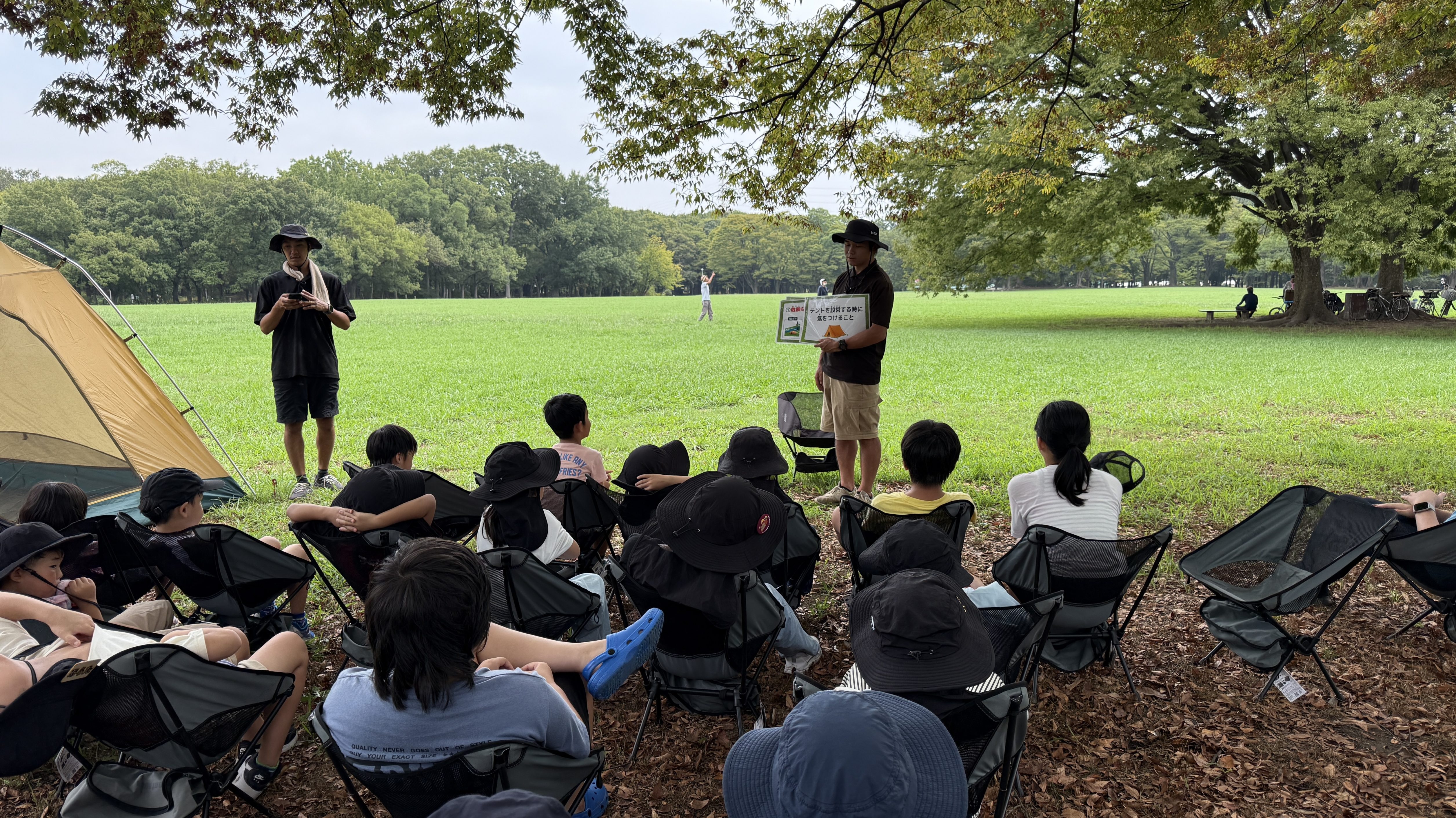 先生から「安全に設営するにはどんなことに気をつける?」と問いかけがあり、子どもたちはフリップを見ながら、風向きや地面の状態を確認して設営する大切さを学びました。