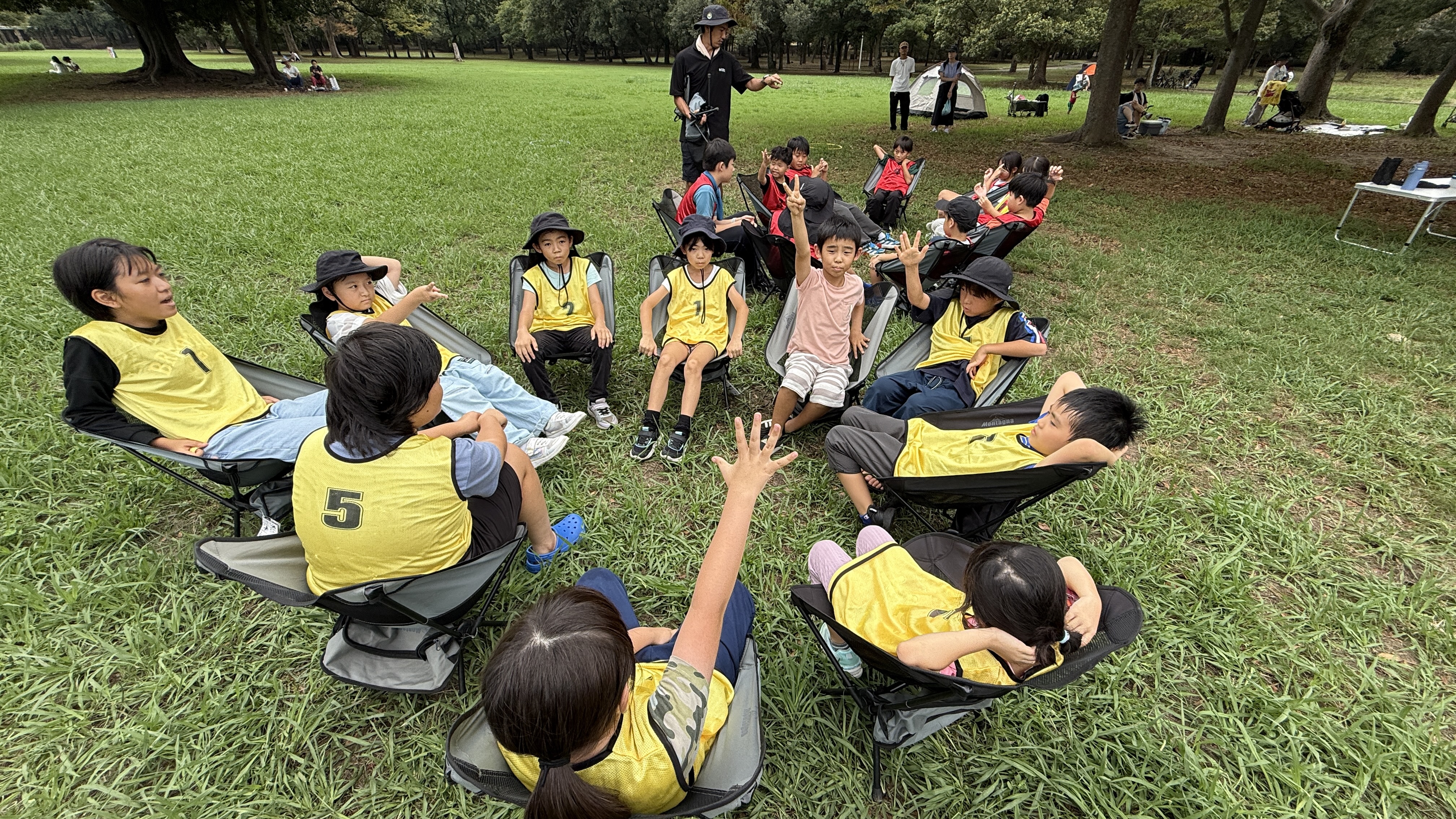フィールドに並べたテントを盾にしながら相手の頭についたポイを破るゲームです。今回は、各チームの「王様ポイ」を破ったチームが勝利という特別ルールで実施しました。