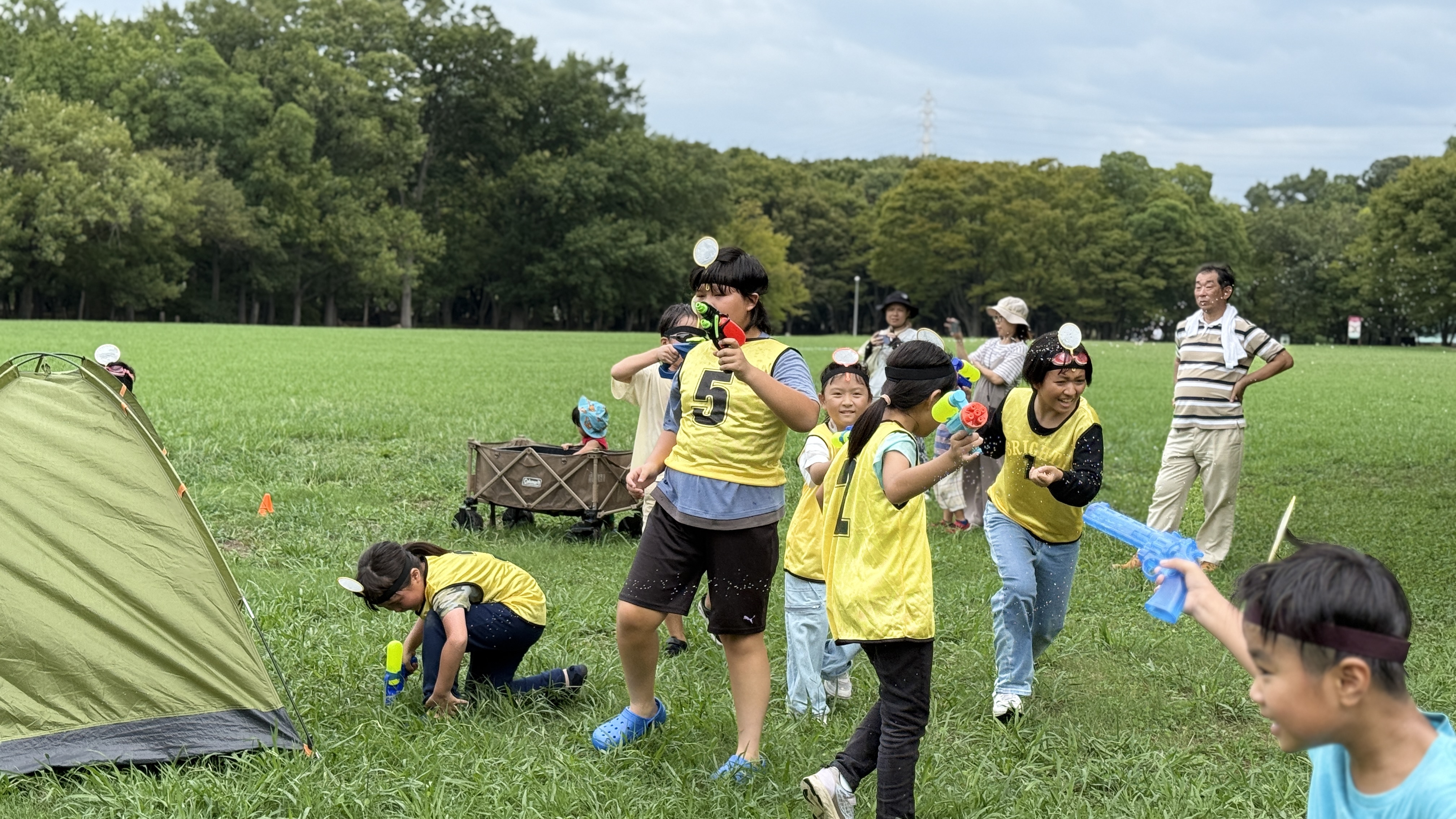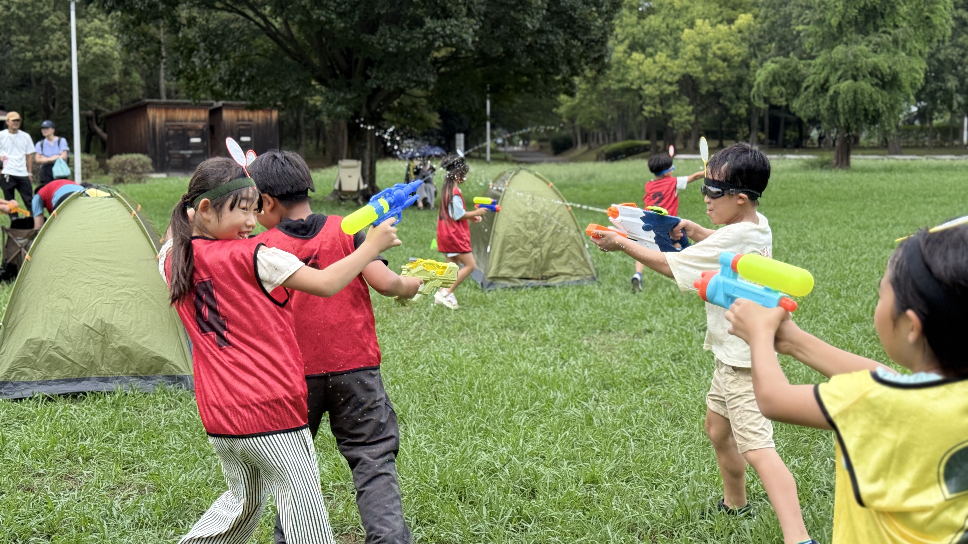 子どもたちは水に濡れるのも気にせず全力で走り回り、「〇〇くんのポイ破ったー!」と喜んだり、「やばい!めっちゃ狙われてるー!」と叫びながらテントに隠れたりと大盛り上がり。