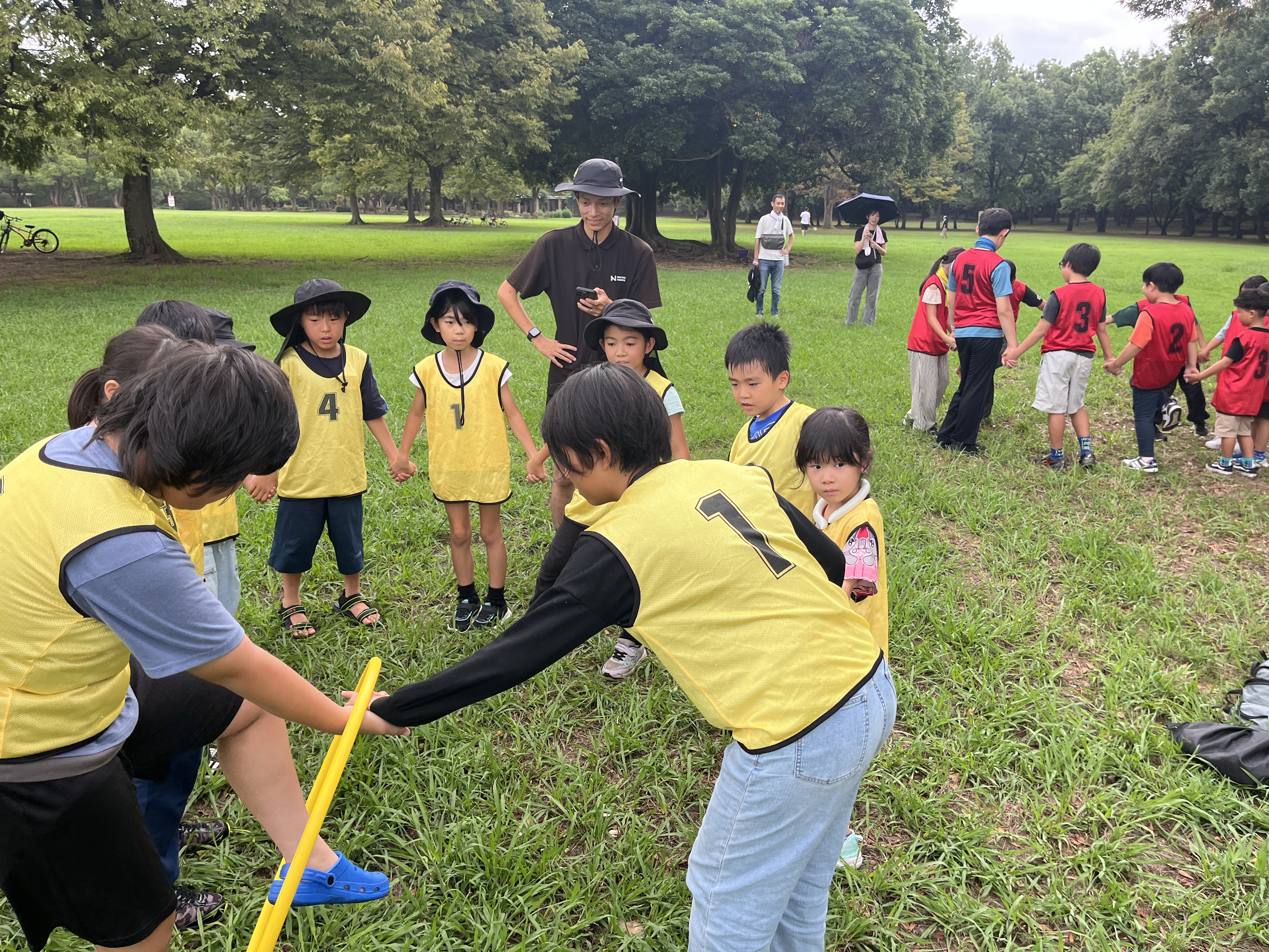1種目は「フラフープリレー」です。チームごとに作戦会議を行い、背の高い子から低い子へつなぐ方法や、頭から通すか足から通すかを相談して挑戦しました。「こっちの方が早いかも!」と工夫し、失敗しても笑顔で立て直す姿が見られました。