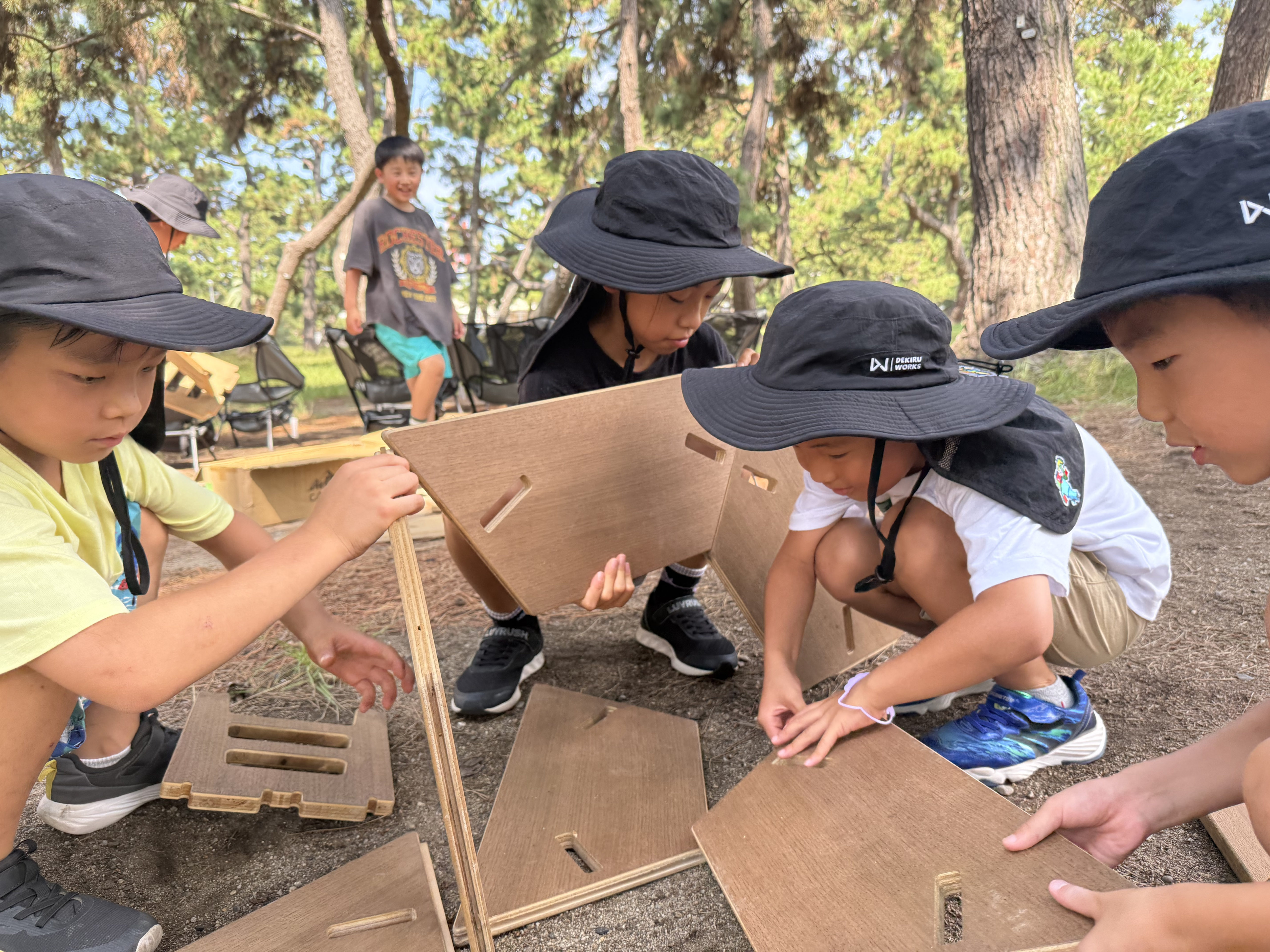 「足が入りにくいからこっちおさえといて!」「ここピッタリ合うやん!」と声を掛け合いながら、子どもたちは試行錯誤。友達と相談し、力を合わせてテーブルを完成させる姿はとても頼もしく見えました。