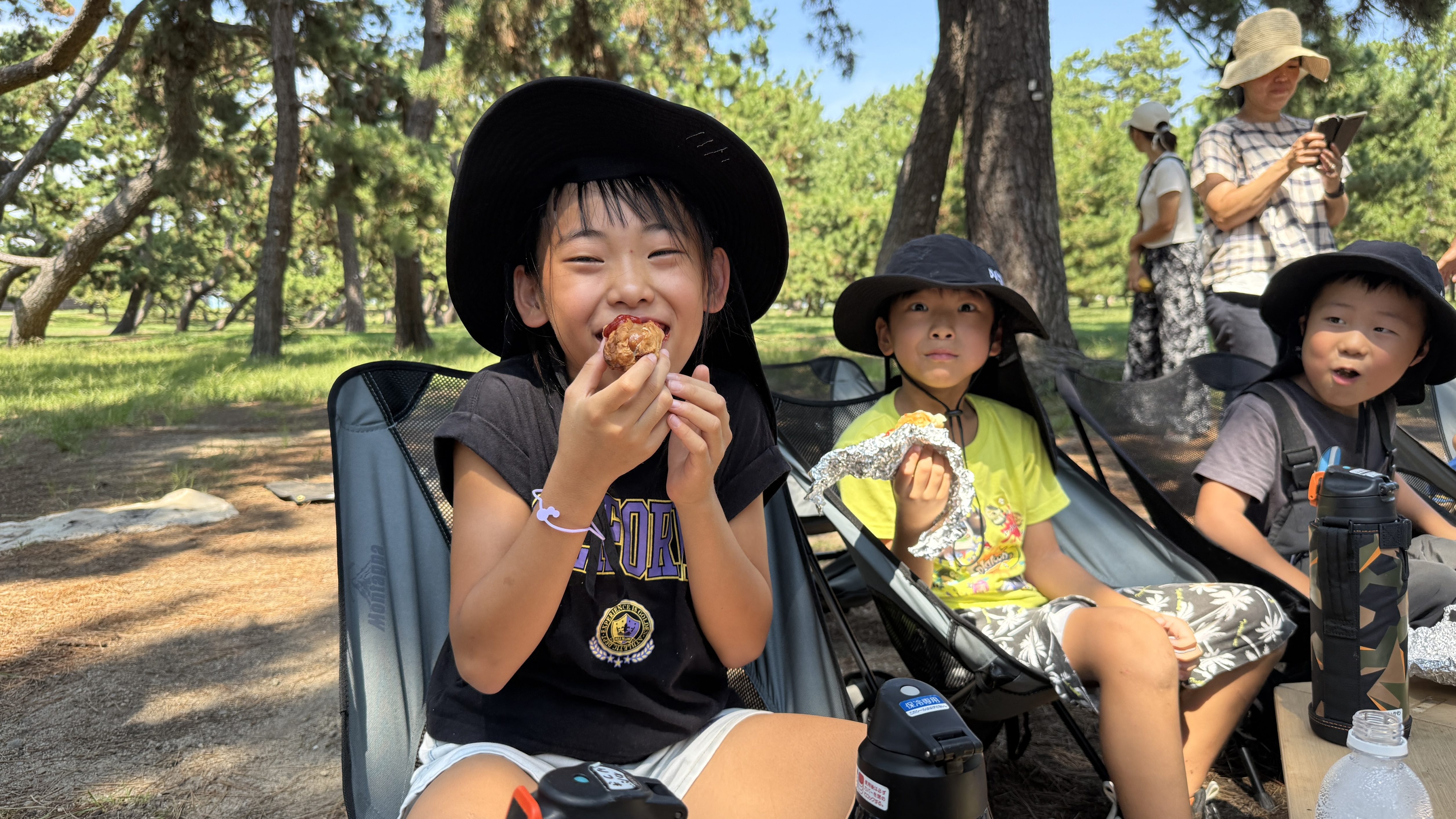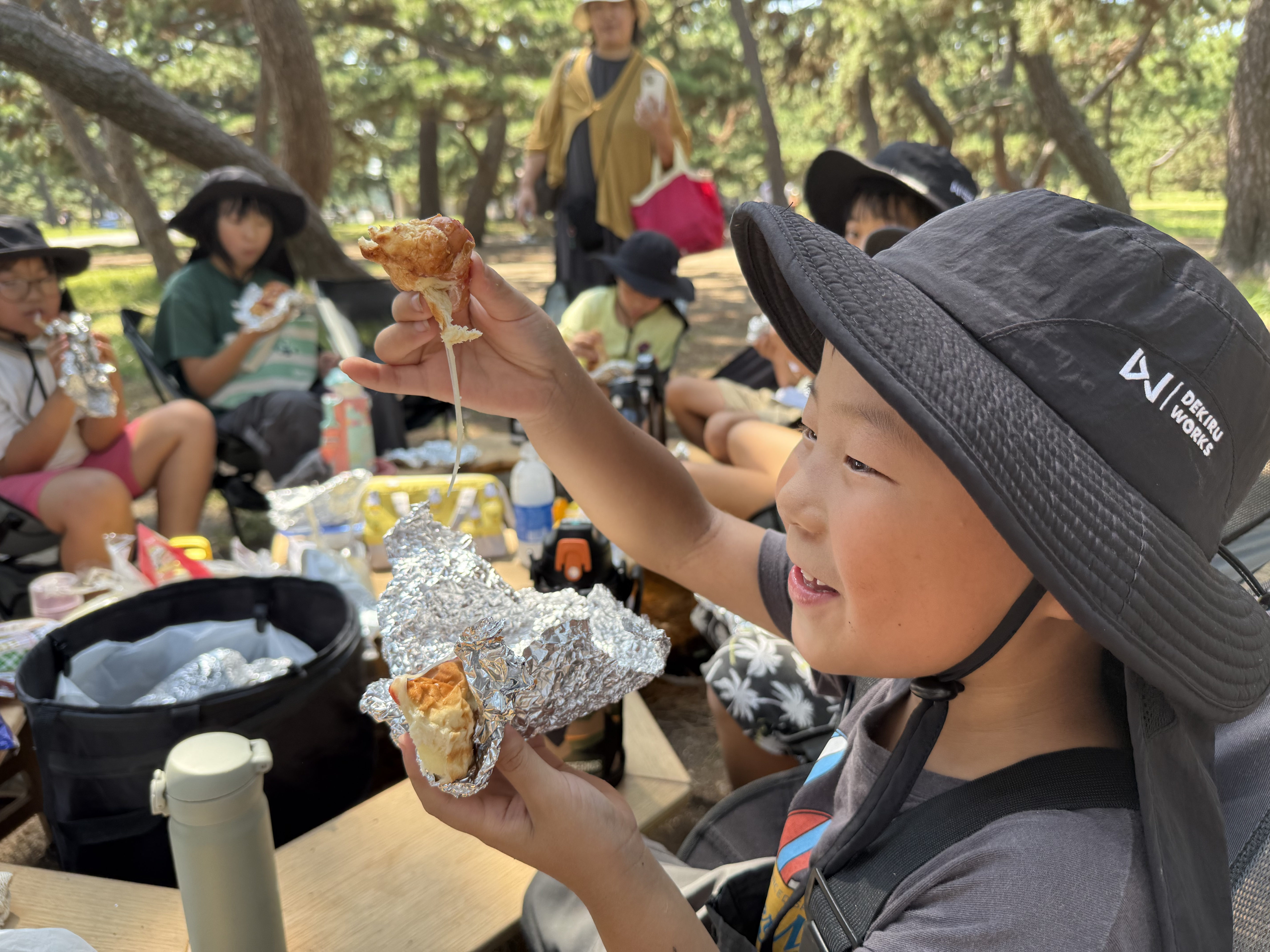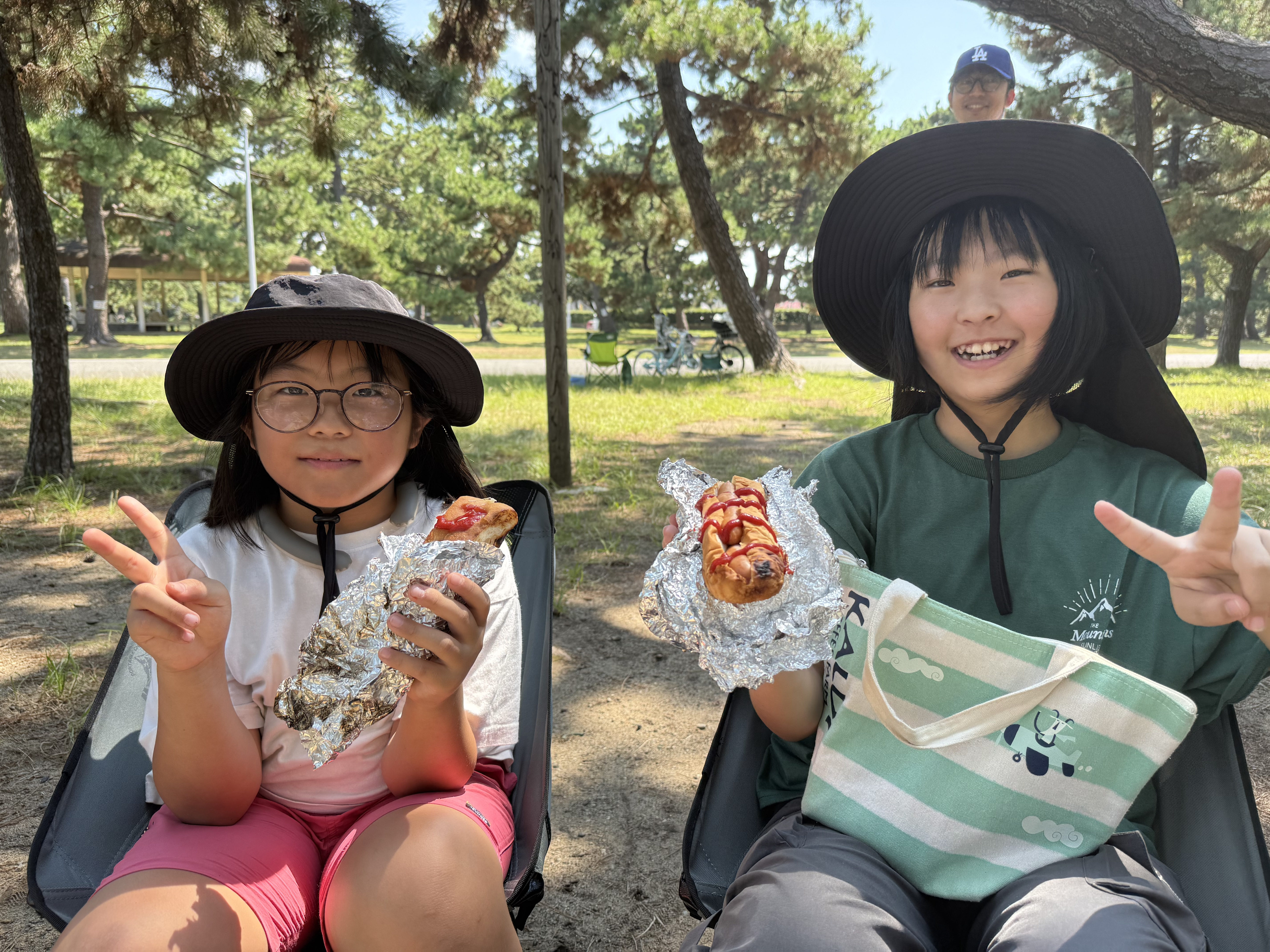 「いい匂いがする!」「焦げてないんかな!?」とわくわくした声が飛び交い、焼き上がったカートンドッグをほおばると「おいしい!」と笑顔が広がりました。