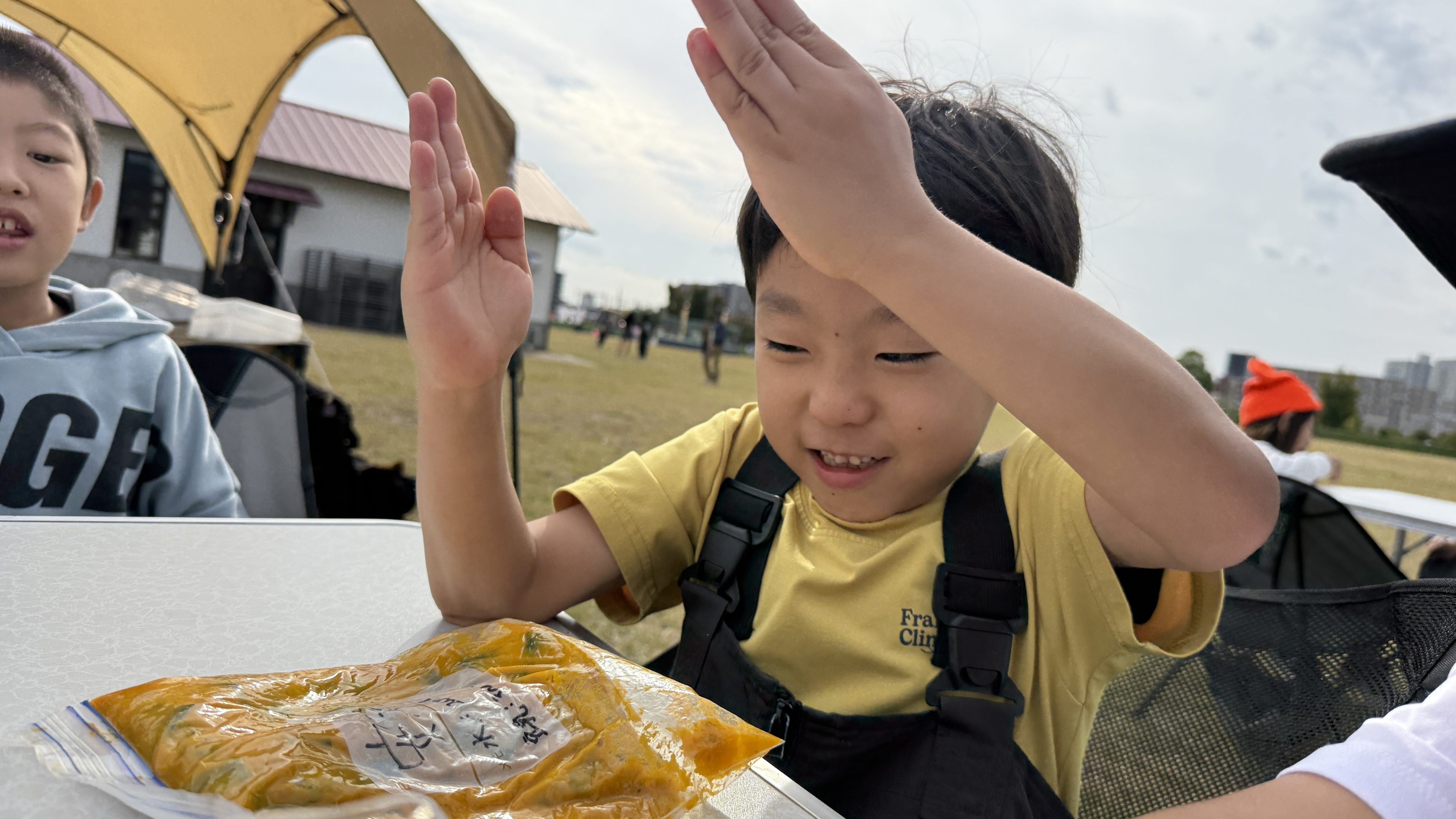火が安定すると、お鍋をかけてスープ作りの仕上げ。ゆっくりと温まる鍋の中をのぞき込みながら「まだかな〜」「いいにおいがしてきた!」とわくわくした表情を見せる子どもたち。時折、風で煙が目にしみるハプニングもありましたが、それも含めて自然の中での貴重な体験となりました。