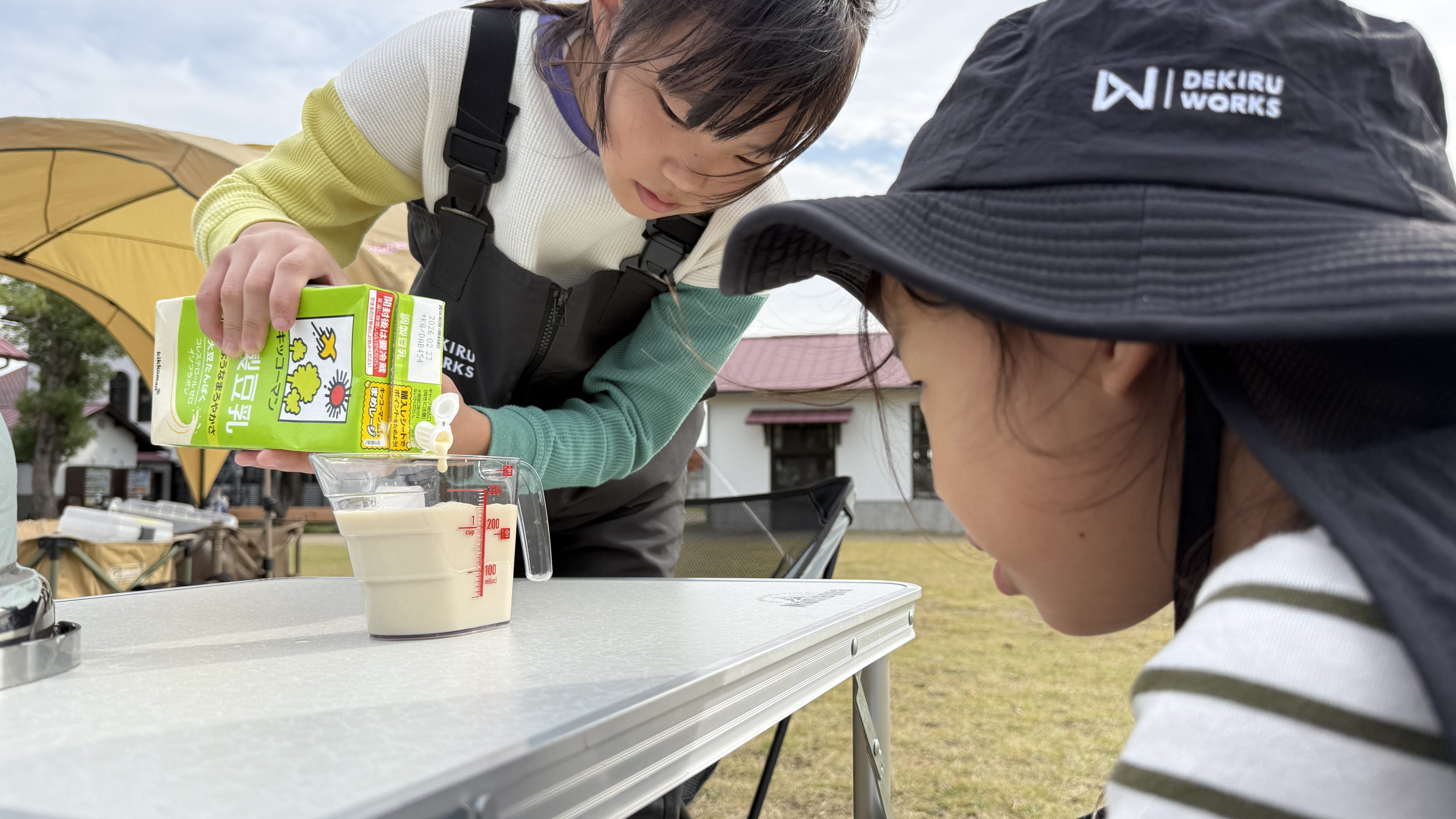 まずはスープの下準備からスタート。事前に下茹でしたかぼちゃをジップロックに入れ、順番にまわして指や手のひらで丁寧につぶしていきます。最初は固かったかぼちゃも、みんなで何度もまわすうちに、なめらかなペースト状に変身。「もう少しつぶした方がいいかも」「いい感じにトロトロになってきた!」と声をかけ合いながら、協力して作業を進めました。続いて、水や豆乳を軽量カップで量って混ぜ、スープのもとが完成です。